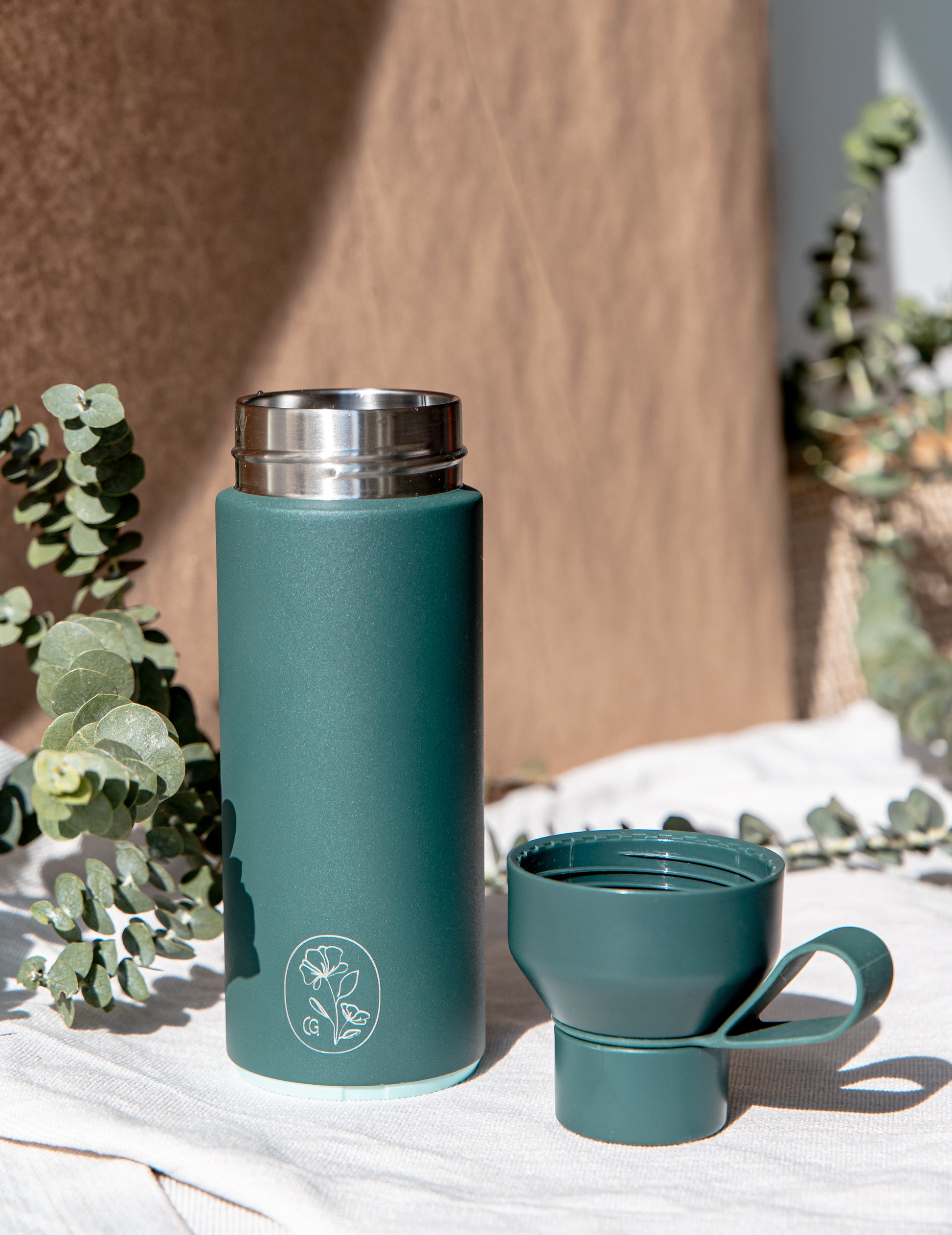 A traveler's essential, it features a screw top with tab for easy carrying, lid with built-in cup for warm drinks on the trail in Big Bear and ice cold ones poolside in San Diego.